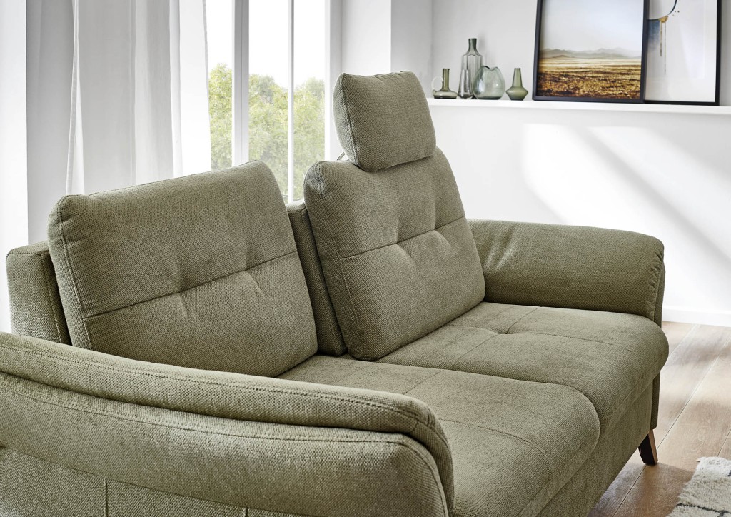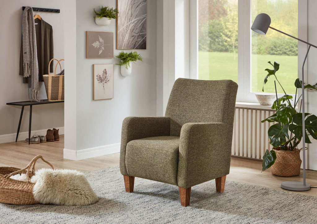 Stoff Amsterdam (Trend D-PG04), Farbe khaki, Rücken echt, Sitz Federkern, Holzfuß Buche eichefarbig geölt, Sitzhöhe 47 cm, SItztiefe 53-68 cm