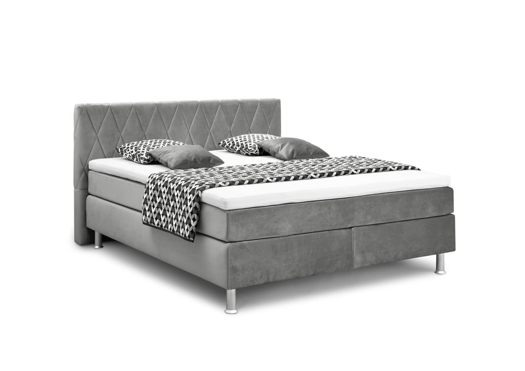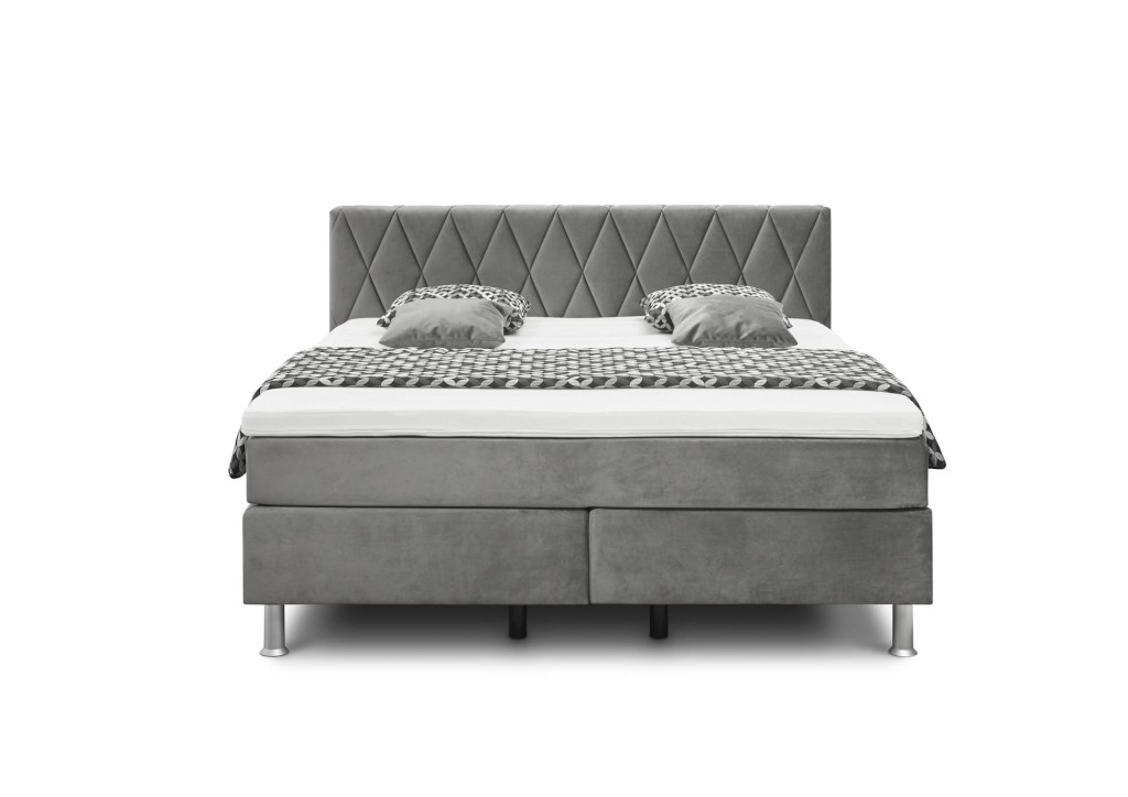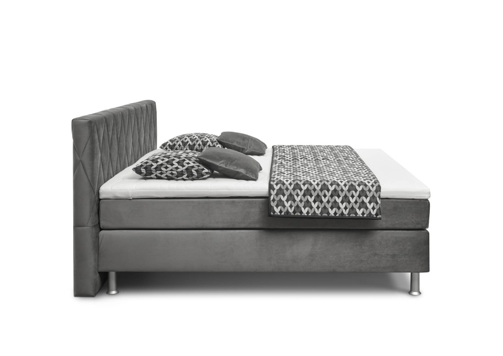 Velours, Nutzschicht 100 % Polyester, Grundschicht 100 % Polyester, Farbe grau, Kopfteil Rücken unecht, Kunststofffüße silberfarbig, Matratzen 5-Zonen Tonnentaschenfederkern H2/H3, Matratzenbezug einteilig, geteilter Unterbau Bonellfederkern glatt, Kaltschaum Topper durchgehend, Liegefläche ca. 180x200 cm, BHT ca. 194/129/215 cm